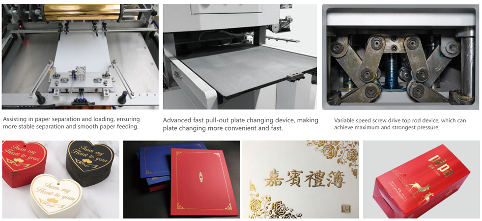 This machine is suitable for hot stamping anodized aluminum onvarious paper products, all kinds of advanced fine printing, can bein this machine for concave and convex hot stamping, flat hotstamping, in order to get three-dimensional sense, exquisite andbeautiful packaging, decoration products, Paper feeding pressureservo control, easy and fast operation.